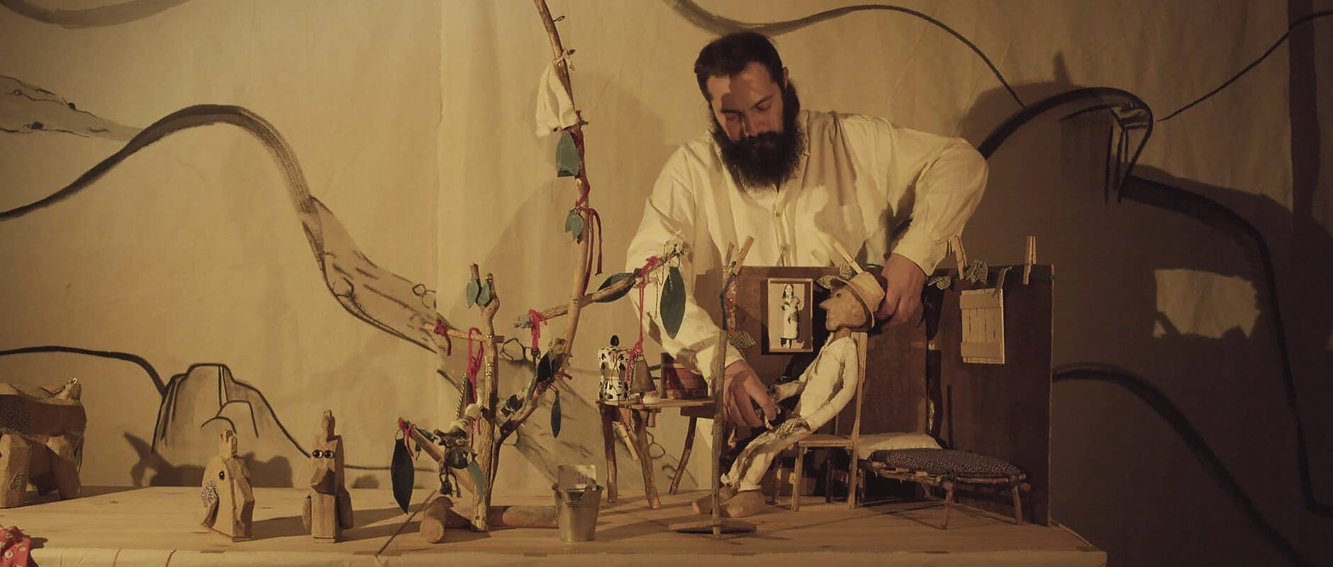 Integrando a marioneta neste ato de partilha de histórias, tornamo-nos ouvintes de palavras que nos transportam e se consolidam através dos objetos que ele manipula em cena.
